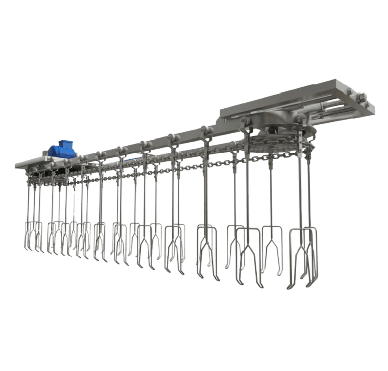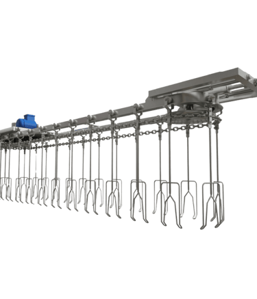El transportador aéreo con cadena mueve productos suspendidos mediante cadenas que recorren un riel superior, liberando espacio en el suelo y evitando obstrucciones. Funciona por gravedad o de manera motorizada, asegurando circulación continua y segura de cargas livianas o medianas, ideal para líneas de producción en serie. Se utiliza en industrias alimenticias (avícolas, cárnicas) y de manufactura (piezas de secado o pintura). Su diseño se adapta a trayectorias curvas, rectas o en pendiente, facilitando desplazamientos verticales u horizontales sin interrumpir la operación en planta.
