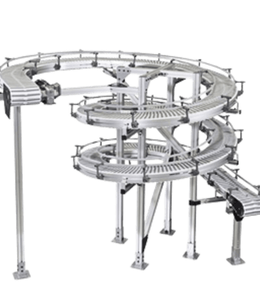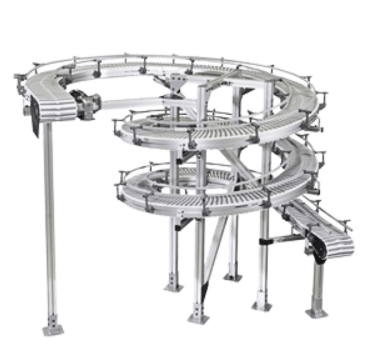 El transportador tipo espiral permite el movimiento vertical continuo de productos mediante una banda helicoidal, optimizando espacio en planta y conectando diferentes niveles sin necesidad de elevadores adicionales. Ideal para productos empacados, cajas o bultos, garantiza un flujo constante evitando daños o acumulaciones. Usado en centros logísticos, líneas de empaque y sectores que requieren eficiencia y ahorro de espacio. La banda puede ser modular plástica o de acero, facilitando limpieza y mantenimiento, asegurando durabilidad y rendimiento continuo en procesos industriales exigentes.