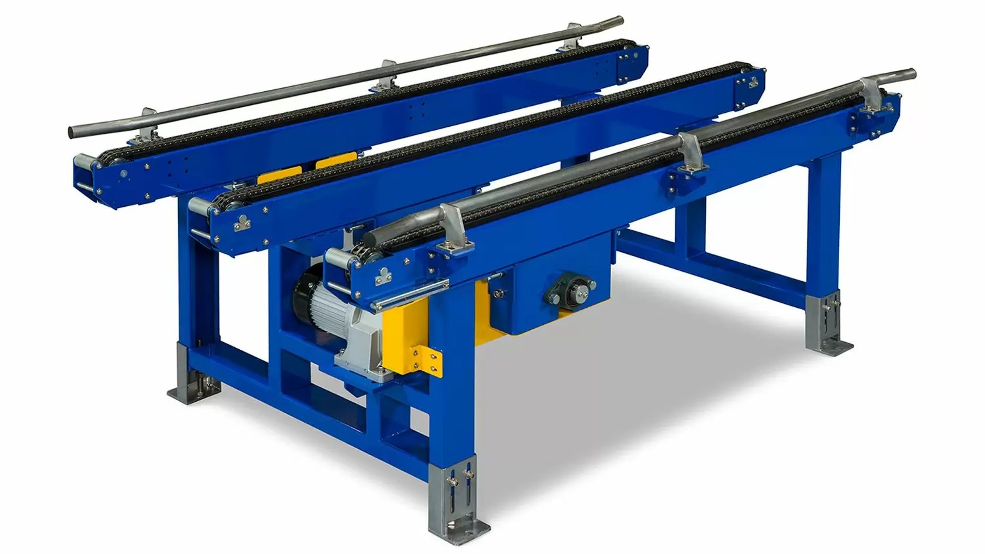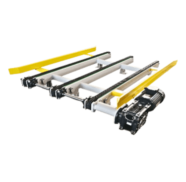 Por su parte, el equipo transportador horizontal con cadena está diseñado para mover cargas pesadas o voluminosas en trayectos lineales o curvos, con gran estabilidad y sincronización. Su sistema modular facilita la integración con otras máquinas o líneas de producción, adaptándose a las necesidades específicas de cada proceso.
